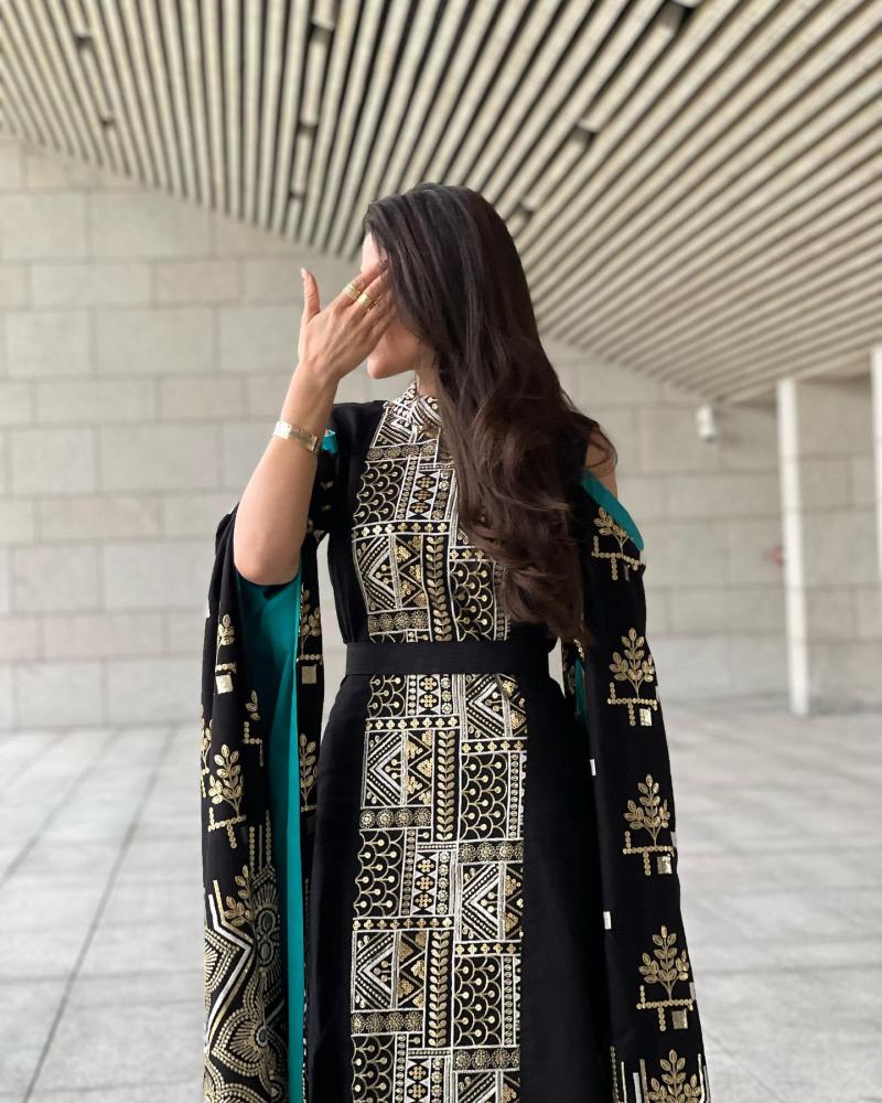 • نوع القماش: قماش فاخر مزين بتطريزات ذهبية فاخرة.