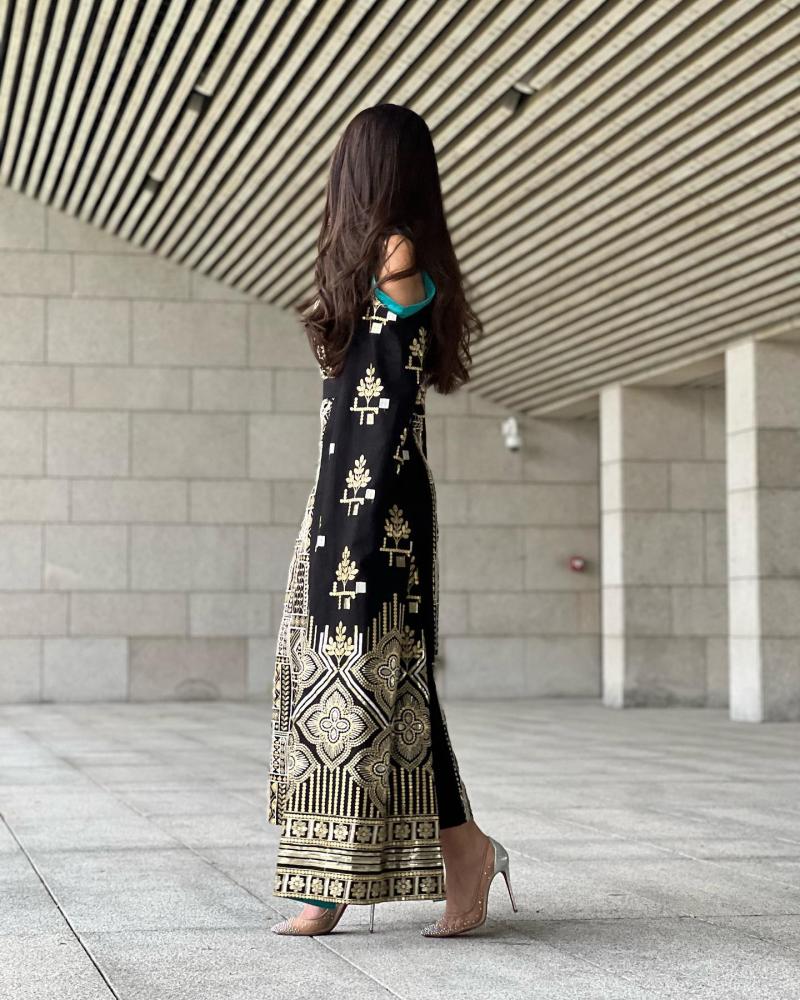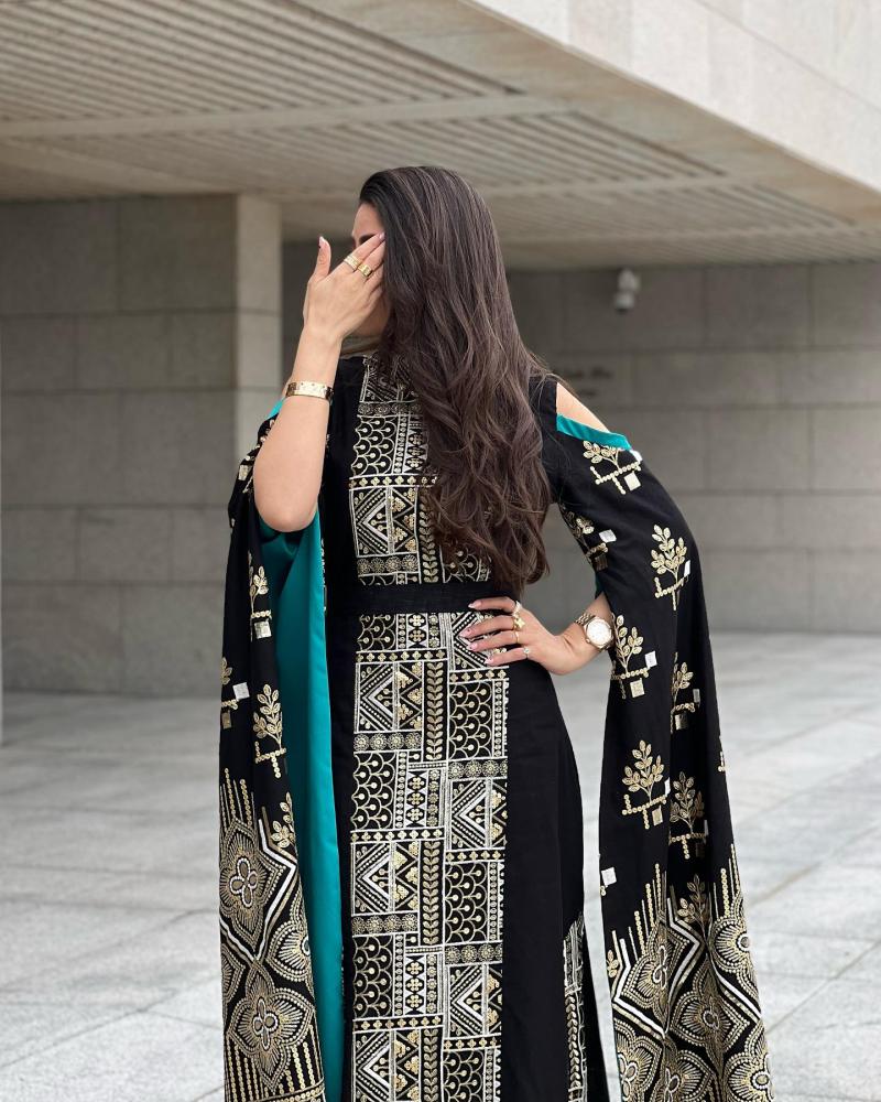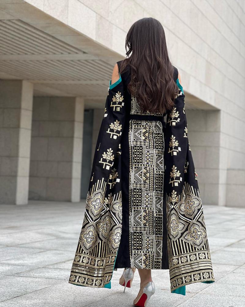 • تتميز الجلابية بتصميم راقٍ يجمع بين اللون الأسود الكلاسيكي ولمسات تطريز ذهبي فخم مستوحى من النقوش التراثية.